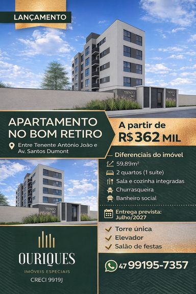 Sofisticação, conforto e valorização no Bom Retiro Apresentamos uma oportunidade exclusiva para quem busca viver com elegância e inteligência patrimonial. Este apartamento no Residencial Buona Vita, localizado em uma das áreas mais desejadas do bairro Bom Retiro, em Joinville, une arquitetura contemporânea, excelente distribuição de espaços e alto potencial de valorização. Com 73,55 m² privativos, o imóvel oferece uma planta harmoniosa e funcional, composta por 3 dormitórios, sendo 1 suíte, ambientes integrados que proporcionam amplitude e luminosidade natural, além de acabamento pensado para quem valoriza conforto e qualidade de vida. A unidade conta ainda com 1 vaga de garagem e 98,55 m² de área total, garantindo praticidade no dia a dia. O empreendimento se destaca pelo padrão construtivo moderno, planejamento inteligente e condições facilitadas de aquisição, incluindo financiamento associativo, ideal tanto para moradia quanto para investimento seguro e estratégico. 📍 Localização privilegiada em região valorizada 📅 Entrega prevista: Dezembro/2027 💰 Valor: R$ 531.335,00 Um imóvel que traduz estilo, exclusividade e visão de futuro.