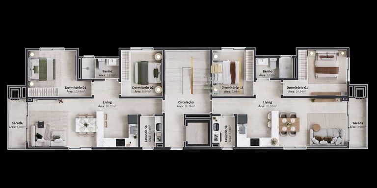 Apartamentos com 2 quartos, ambientes integrados entre sala e cozinha, sacada com churrasqueira e 1 vaga de garagem.