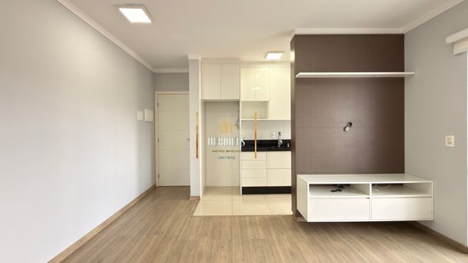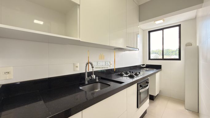 Ambientes integrados entre sala e cozinha, sacada com churrasqueira.