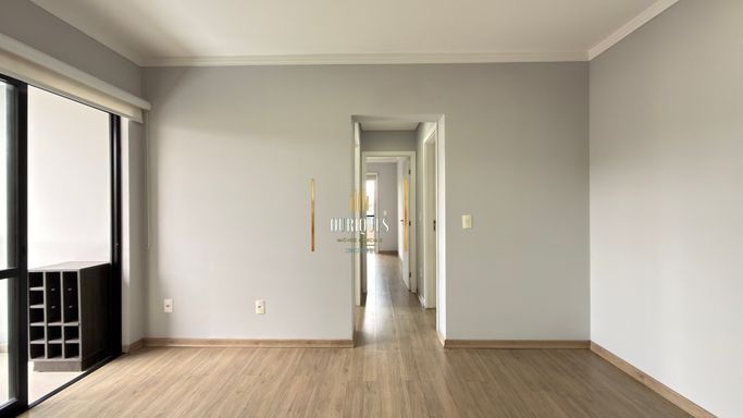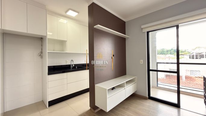 Torre única com elevador e salão de festas, apto semimobiliado com 55m², 2 quartos sendo 1 suíte com sacada.