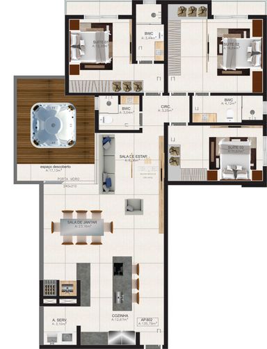 Apto Cobertura de 140m² Privativos, 2 suítes mais 1 quarto, 2 vagas cobertas, ambientes integrados entre sala copa e cozinha, churrasqueira, e sacada.