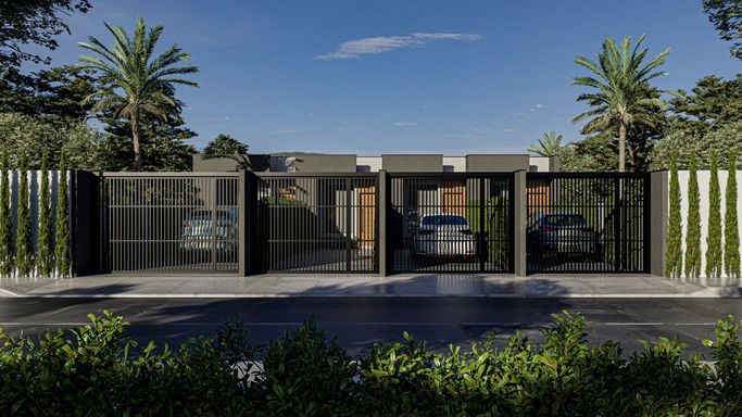 Geminado planta baixa com 53m², 2 quartos, ambientes integrados entre sala e cozinha, área de serviço e espaço para churrasqueira nos fundos.