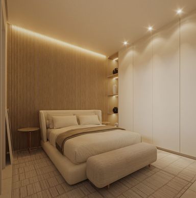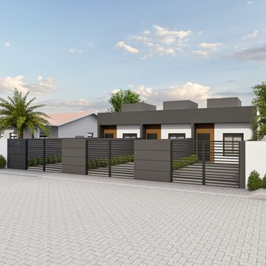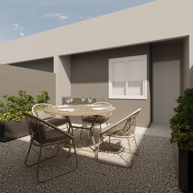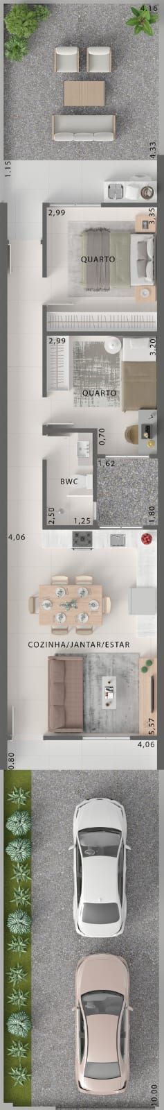 Possui 59m², ambientes integrados entre sala e cozinha, 2 quartos e 1 banheiro social.