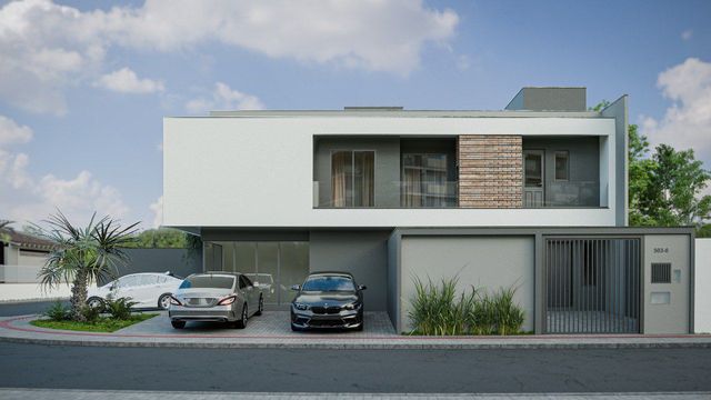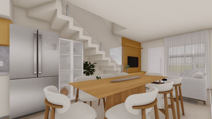 No pavimento térreo ambientes integrados entre sala e cozinha, lavabo, área de serviço e churrasqueira.