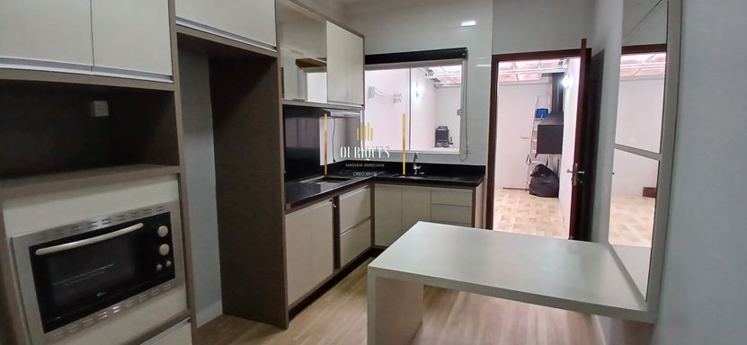 Possui 2 quartos e 1 banheiro social no piso superior, no pavimento térreo sala de tv, cozinha e lavabo.