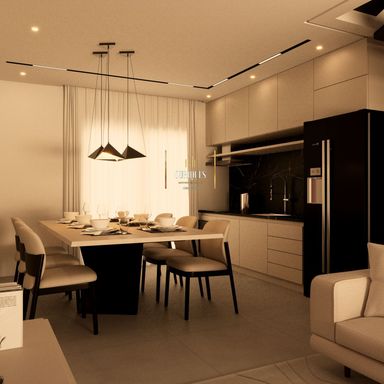 No pavimento térreo ambientes integrados entre sala e cozinha, área de serviço com churrasqueira e 1 lavabo.