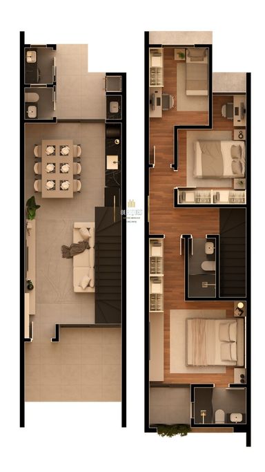 Imóvel conta com 108m²,no piso superior 3 quartos sendo 1 suíte e 1 banheiro social.