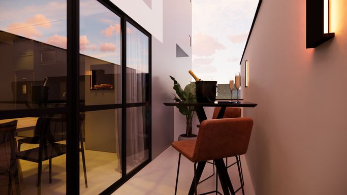 Possui 57m², com ambientes integrados entre sala e cozinha, 2 quartos sendo 1 suíte, área de serviço e churrasqueira.